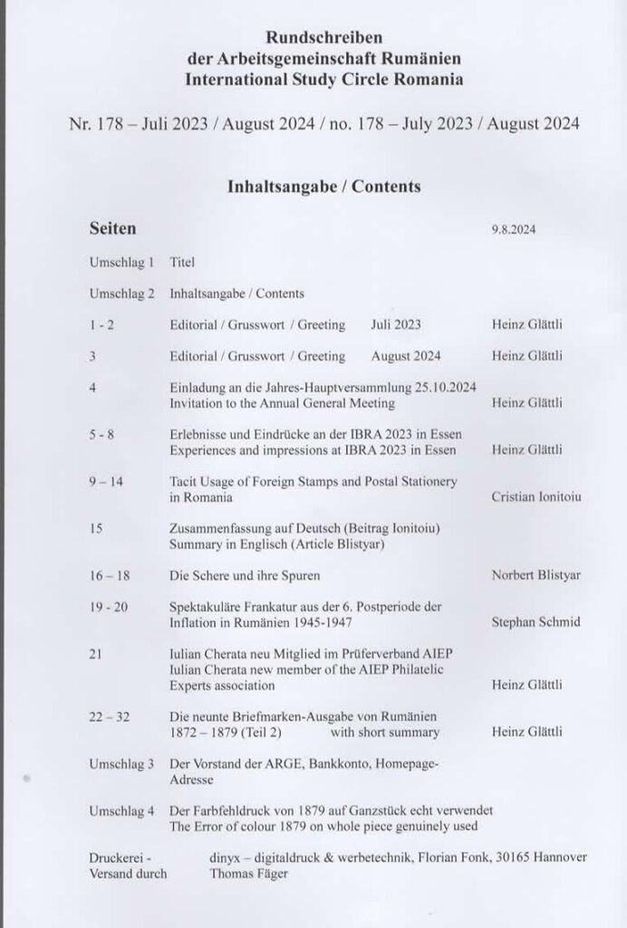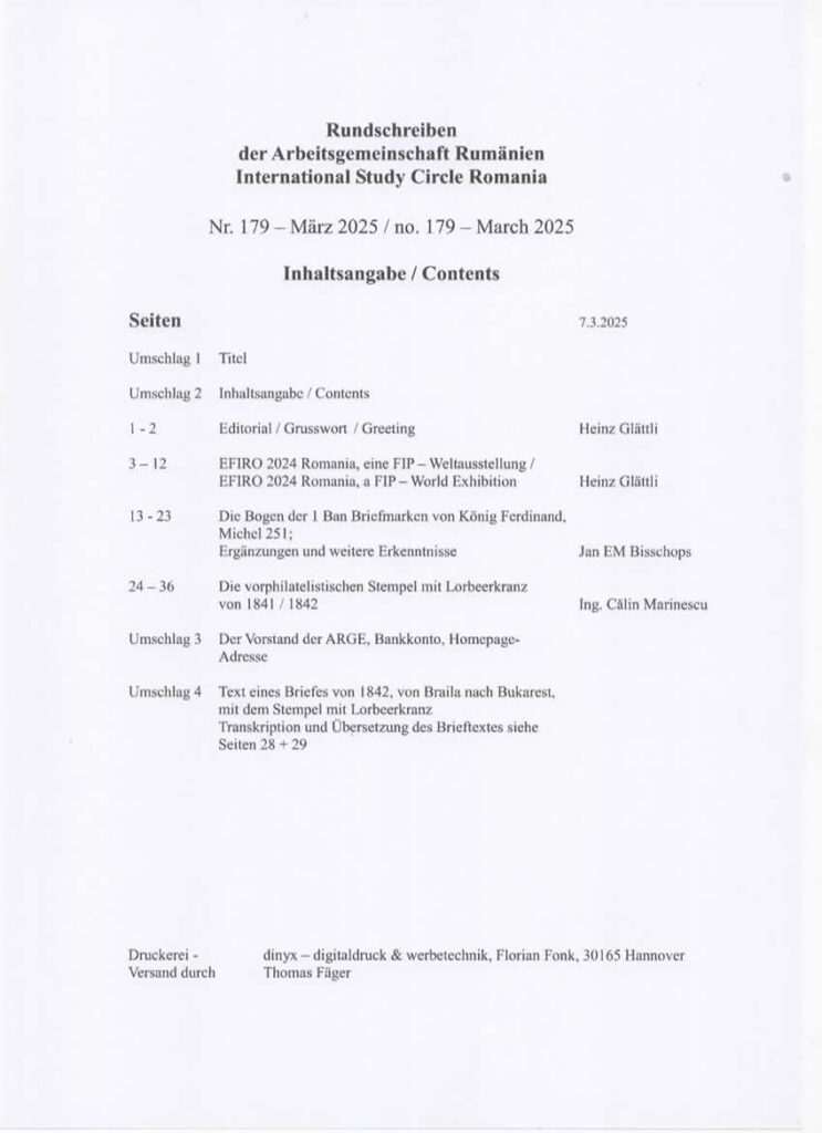 Articles which surpass a limit of some 12 pages will generally be published in more than one issue of the „Rumäniensammler“ (after agreement with the author). As a general rule, every text from the author will be adopted by the publisher without text reduction; any exception from this rule will be discussed with the author in advance. Members of the ARGE may expect, their contributions will be published in the circular; eventually in parts, in due time. Contributions from non-members of the study group are, as an exception, accepted/welcomed; the board decides (as a unit) about the publication of such third-party articles.